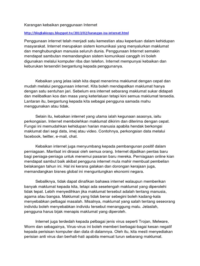 Kini, internet merupakan salah satu saluran rangkaian penghubung dunia yang telah mengecilkan dunia. Oleh itu, saya menyeru agar semua pihak dapat menggunakan internet dengan baik. Antara keburukan internet terhadap pelajar ialah mereka bebas melayari laman web tanpa kawalan kerana internet dikatakan dunia tanpa sempadan. Sistem ini boleh diperoleh melalui komputer atau televisyen. Internet merupakan sistem komunikasi yang menyampaikan maklumat dari seluruh dunia.
